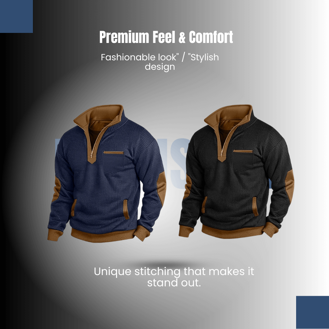 It’s got a casual-meets-classy vibe — the half-zip, contrast details, and elbow patches give it that modern outdoorsy look that works anywhere.