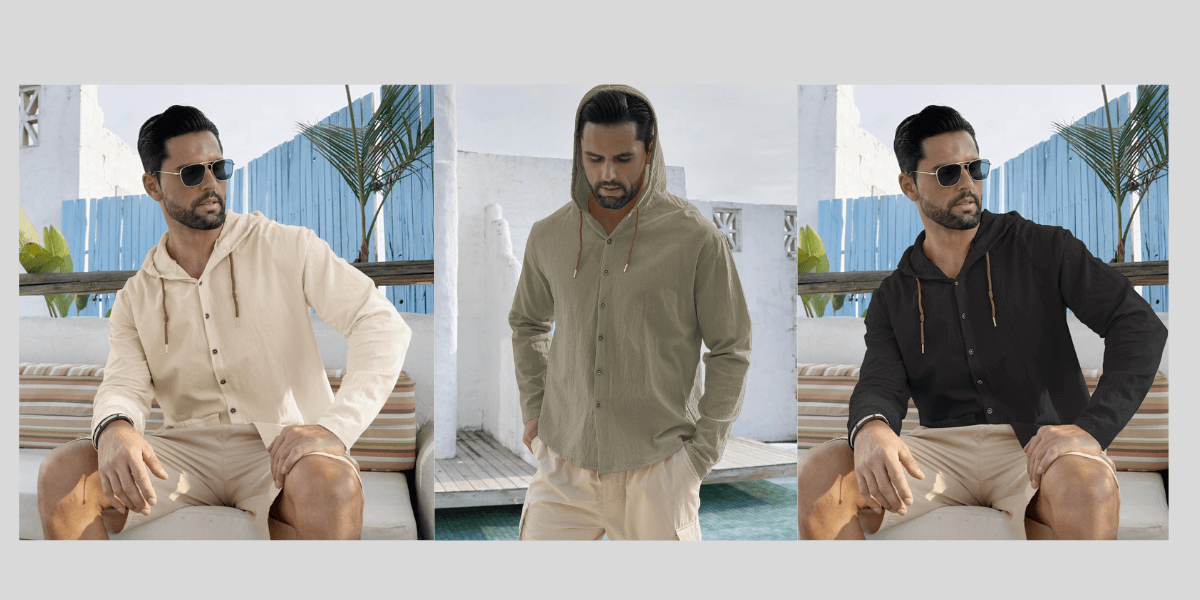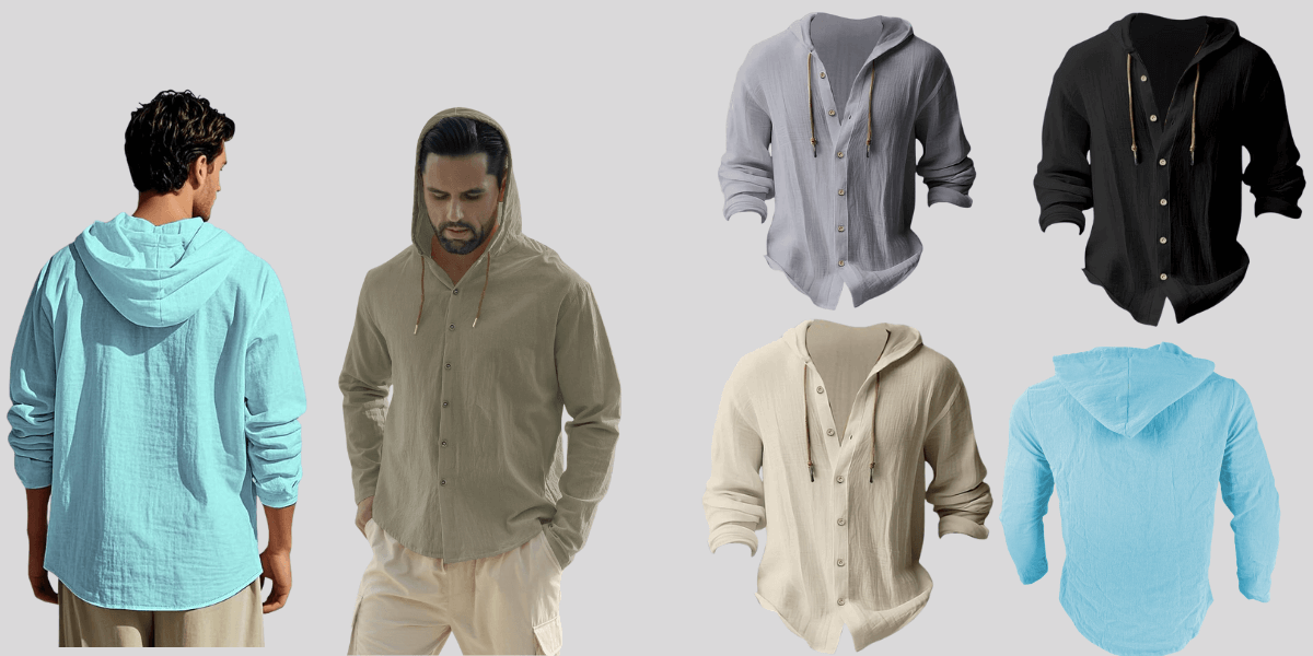• Stay cool and relaxed in this solid-color cotton-linen hooded shirt. Made from a breathable cotton-linen blend, it feels super light and soft on your skin. Perfect for warm weather or layering on breezy days.